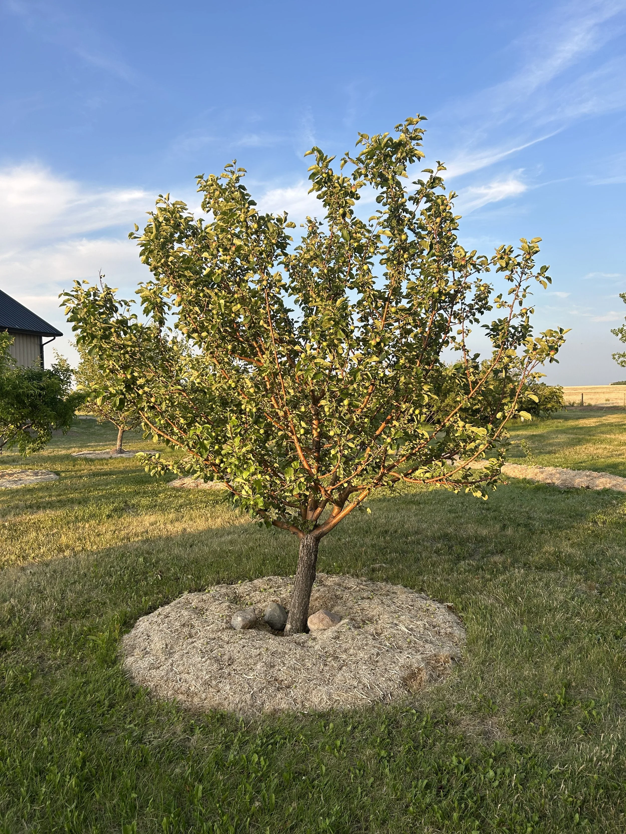 A small tree fruit tree with a tree ring of HempScape in a grassy yard under a blue sky with light clouds